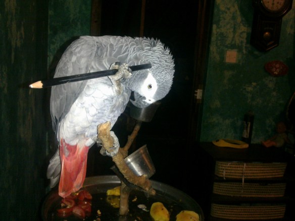 I spent more time than a normal functioning human should trying to teach him to sing the Chinese National Anthem and only as we were leaving did I hear a rendition being whistled by an unknown talent. Perhaps it was Babu, perhaps by the gardener.   Babu’s Pièce de résistance was his ability to scratch the unreachable itchy back of his neck by using a pencil. This was so comforting to Babu that he would close his eyes in ecstasy and wobble off his perch.  If that is not intelligent use of a tool by an animal I don’t know what is. Chimpanzees using sticks to eat terminates? Tom Bloor using rocks to break open nuts?  No comparison.