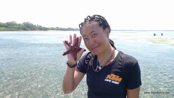 When we arrived the sea was lapping right up to the vertical cliff walls that separated the houses’ large gardens from the ocean, and the daily high tides were clearly eroding into the Allard’s and their neighbours’ beautifully manicured lawns. In the morning when we woke up the tide had gone out about a kilometer or so, exposing rock pools and mangrove channels full of an assortment of starfish of all shapes and sizes, urchins, crabs and fish and fields of equally well manicured seaweed beds. Seabirds were hunting among the pools and the local ladies were harvesting the seaweed which is used, apparently, as an ingredient for cosmetics in the west.  As is the case in Africa, we mzungos (foreigners) are viewed upon by the locals as oddities.