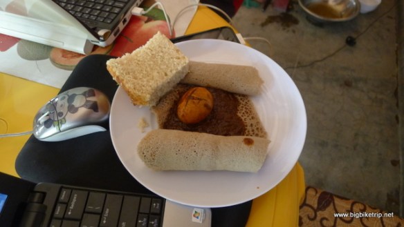 Breakfast consisted of the local dish “tibis“, a huge sour tasting wheaty pancake onto which is usually placed vegetables, meat (often goat) and a spicy bean stew. We thought it was delicious, but the novelty of the dish would wear off somewhat as this was pretty much served up at every meal.  Of course, there was great coffee as one would expect in Ethiopia.