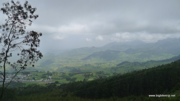The  “village” had suddenly become deserted, but I could just about see clusters of people huddled under any form of shelter, peering at us riding by with mild astonishment.  The rain continued for about two hours and we only made about 30 kilometers progress and then started descending into the first big city we had been to in Ethiopia, Dilla near one of the big mountain lakes.