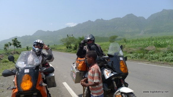 I thought about the fact that we were still riding along the Great Rift Valley and into the true  Cradle of Humankind where our common ancestor, Lucy came from. I remarked to Fanny what an amazing place Ethiopia was to ride through…like a perfect early morning motorcycle ride through Wales or Yorkshire on a sunny spring day.  This was the Garden of Eden and surely all the negative reviews we got from fellow travelers who had journeyed through Ethiopia were exaggerated.
