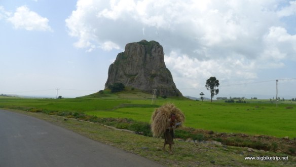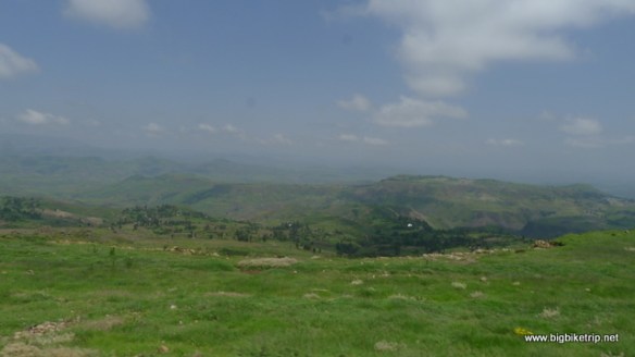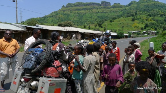 The ride there was long, but an excellent one and we started riding back up into huge mountain ranges along steep windy roads with precarious cliff sides. Fanny complained that she was scared of heights and certainly this phobia was tested as we looked down many thousands of meters across lush valleys. The donkeys, goats and cows were back again in huge numbers on the road, and so were the brats throwing stones. The altimeter on the GPS showed us at over 4,000 meters on one occasion as we rode along a spectacular mountain plateau to the turn off down into the Amhara region towards Lalibela.