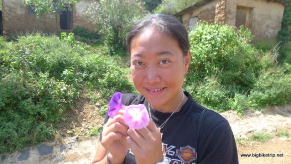 I continued to marvel at the beautiful roads and pristine surroundings as we rode leisurely through fields of flowers and past the occasional villager or child who would wave enthusiastically towards us. After a few hours we stopped for a call of nature and were suddenly swamped by kids. Where on earth did they come from? The only words many of  them knew in English were ‘Money, money, money’. Poor little things I thought and then felt my “nuts”  being moved about inside my trousers and looked down to see an angelic looking child of about three or four with its arm in my trouser pocket.