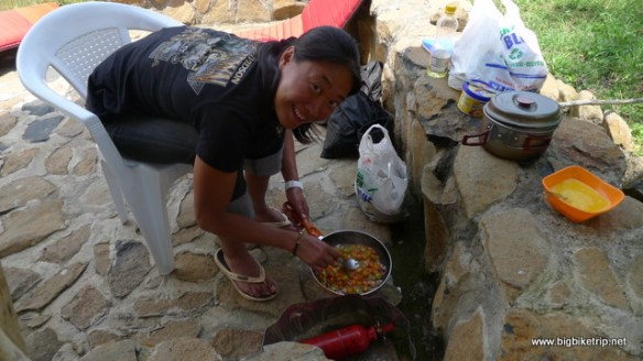 When we arrived we were the only guests and the cook and many of the staff were missing and so we set up camp, got out the Whisperlite cooker and Fanny prepared a spicy Chinese cabbage dish (re qiang bao cai) that is very popular in Hunan with fried egg and tomato (fanqie chaodan), another basic favourite all across China. Outstanding food and very welcome. There was no running water at the camp-site yet and so we had to use buckets of  post rainy season brown lake water. You gotta love camping.