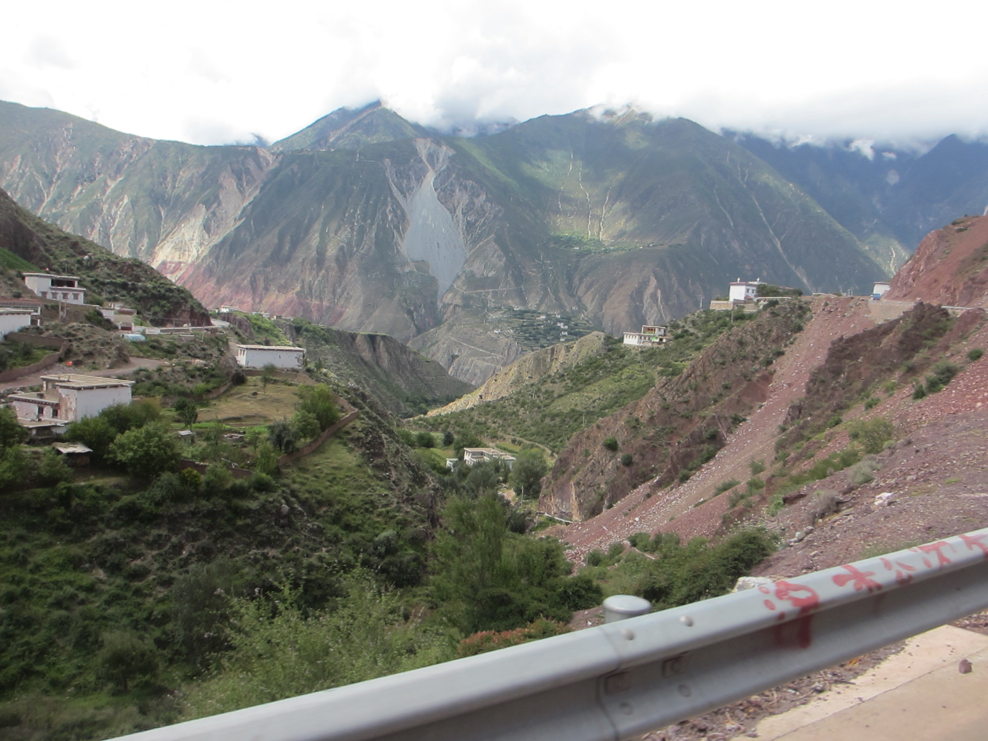 In eastern Tibet the road goes up and down between 3,000 meters to 4,000 meters – many times. The roads are often carved into the side of very steep slopes and sometimes the road has completely or partially collapsed or has debris strewn over from landslides. It was a bit nerve wrecking on our bikes and I cannot imagine driving one of the trucks with the wheels hanging over the side. We did see some unlucky ones that had gone over the side.