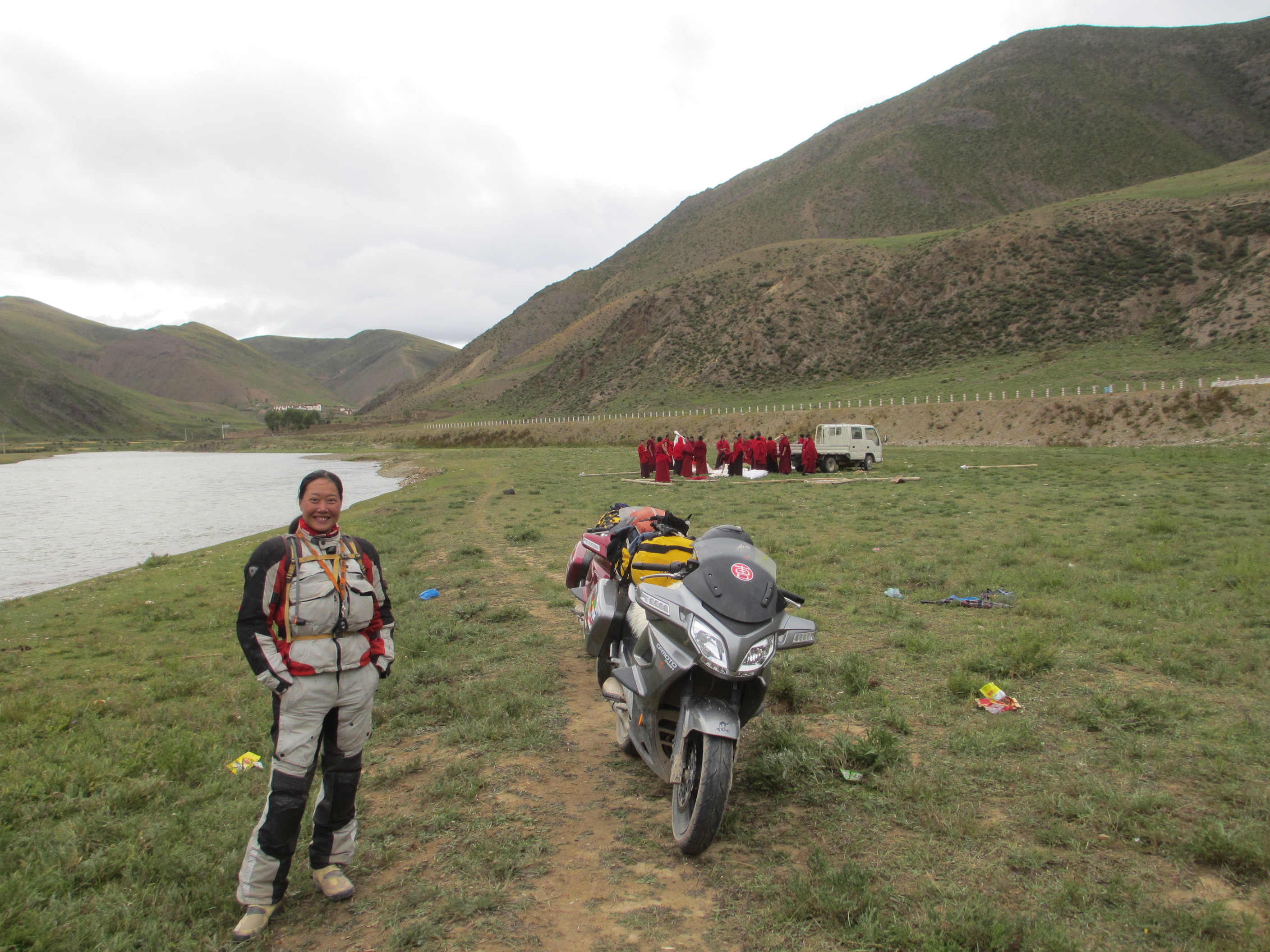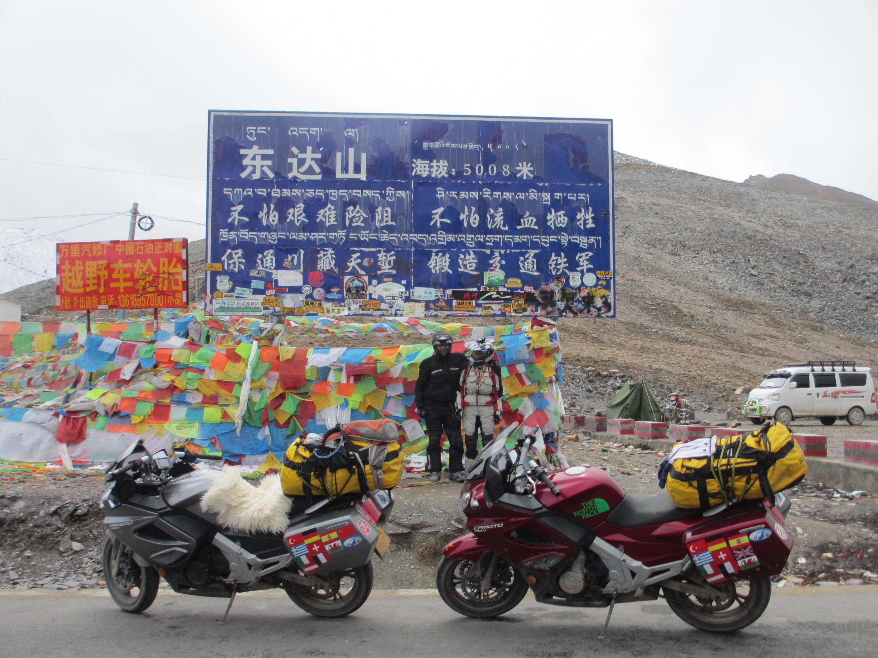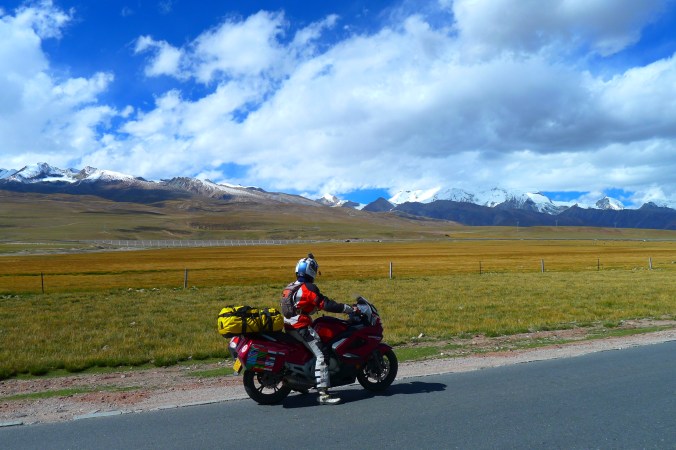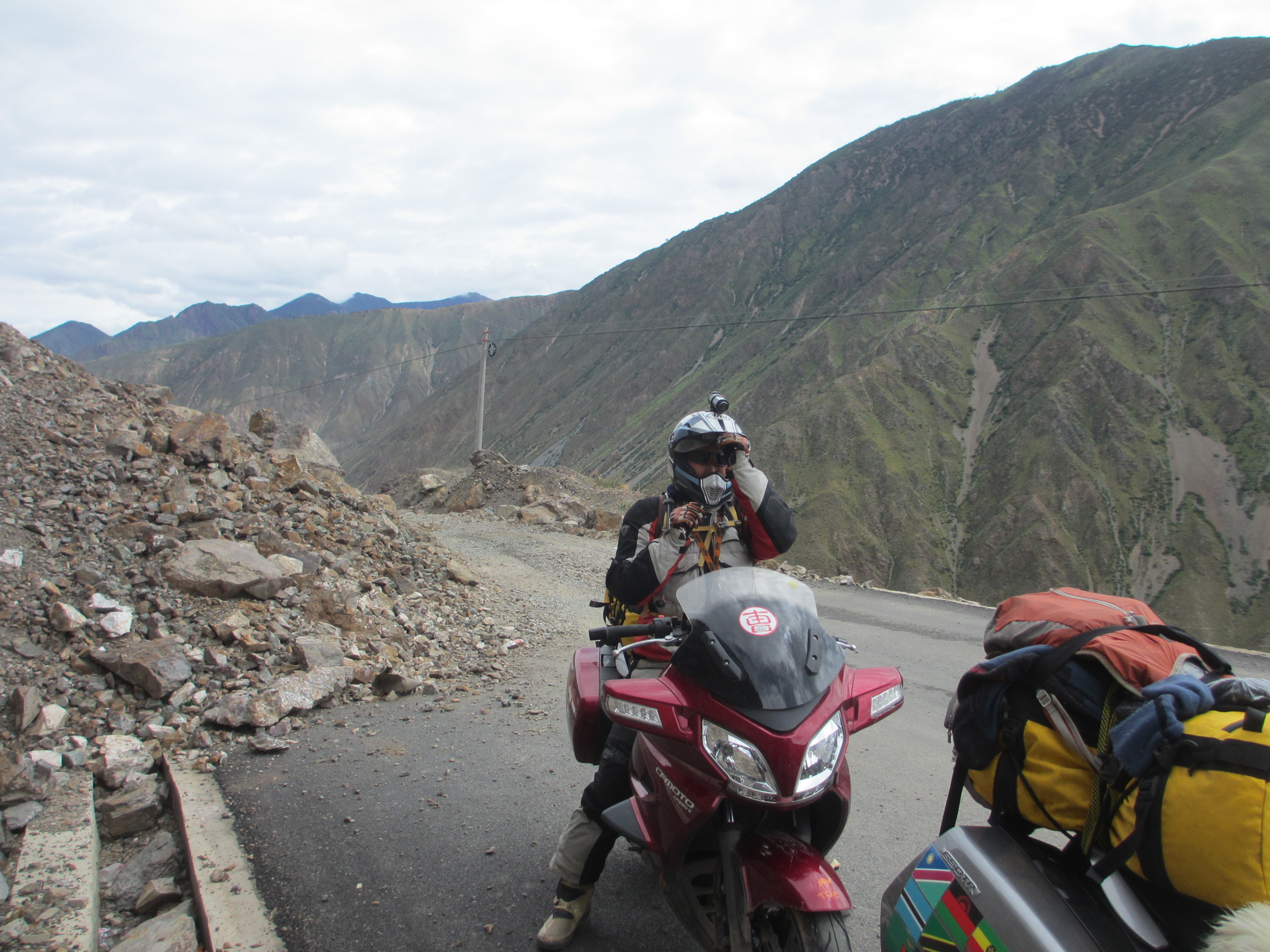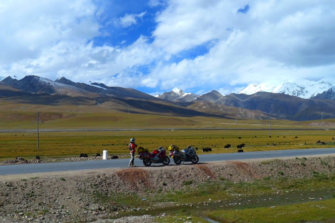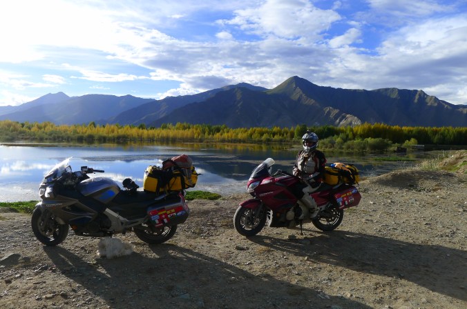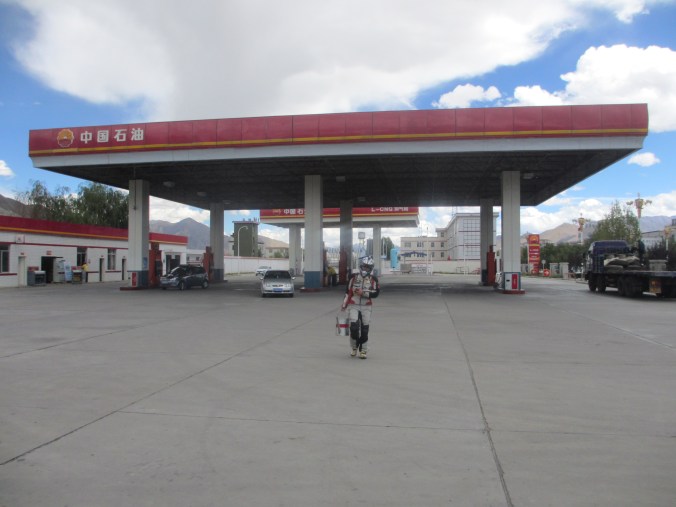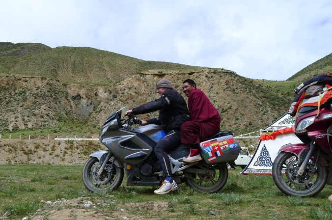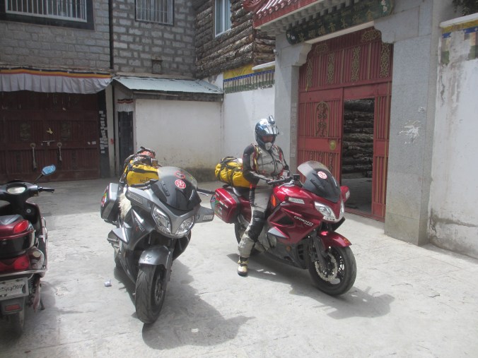 The tank of Fanny’s bike sprung a leak because a rubber supporting mount was missing and after 6,000 kilometers “on road” and “off road” it vibrated a crack in the attachment. A bit dangerous, especially as self immolation is illegal in Tibet. Therefore we had to ride with no more than 30% of fuel in the tank at all times which meant siphoning fuel from my tank for several hundred kilometers until we got a new tank in Lhasa sent from Hangzhou. All part of the testing program, I guess.