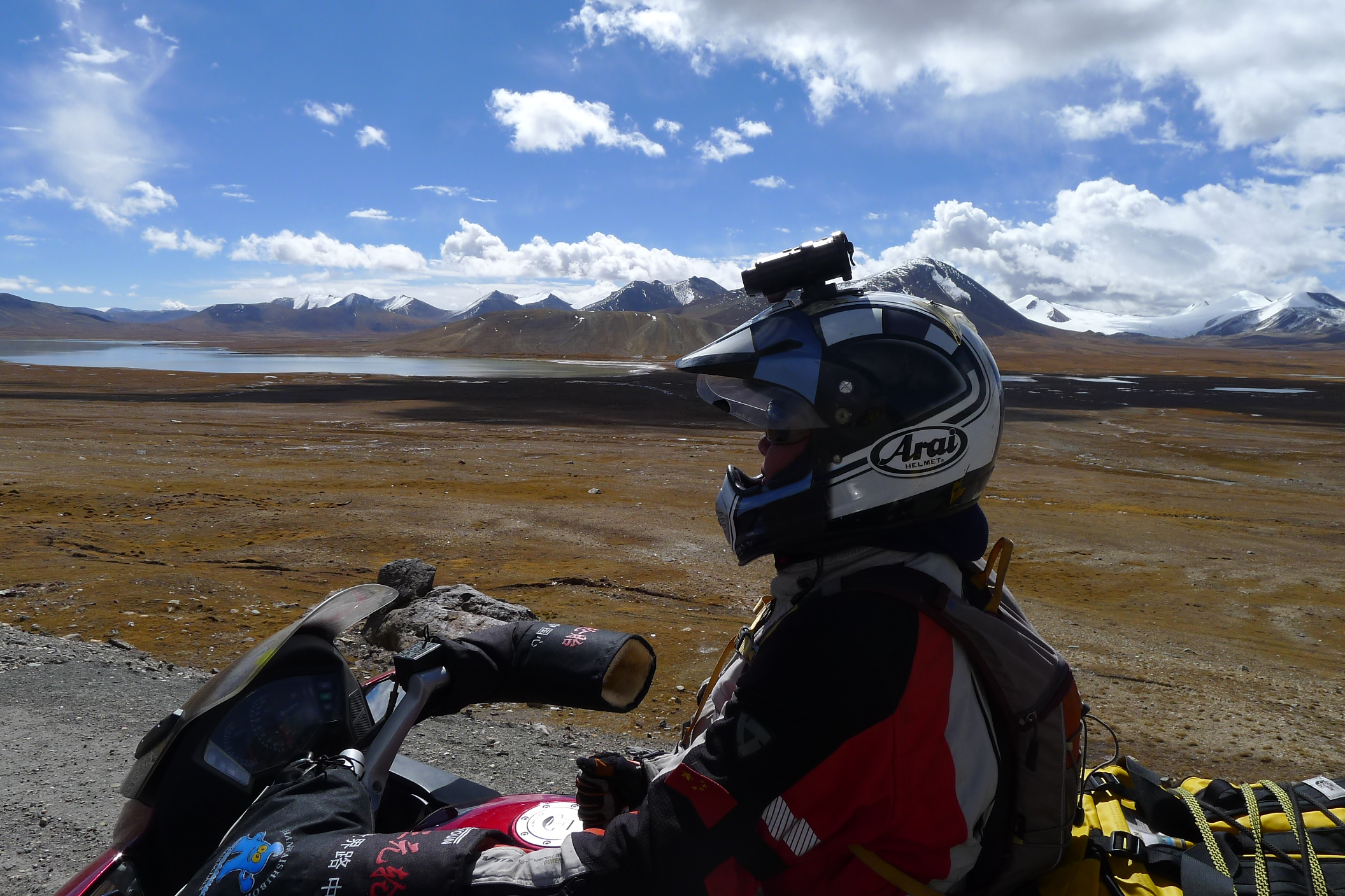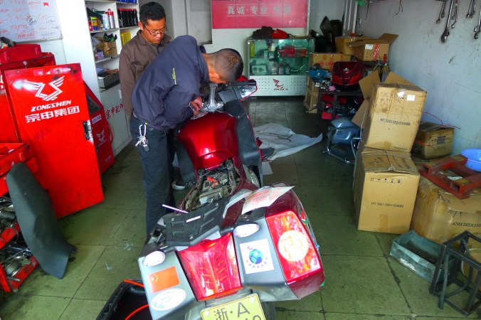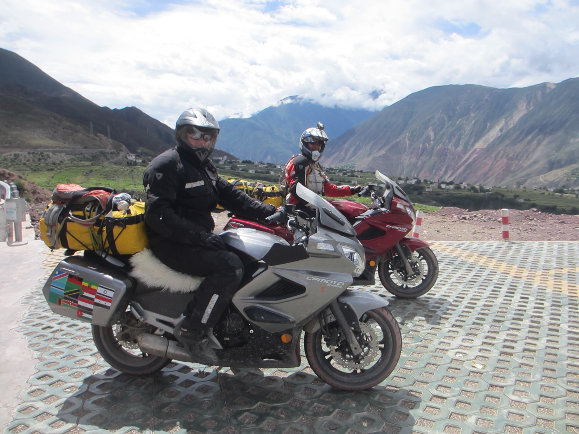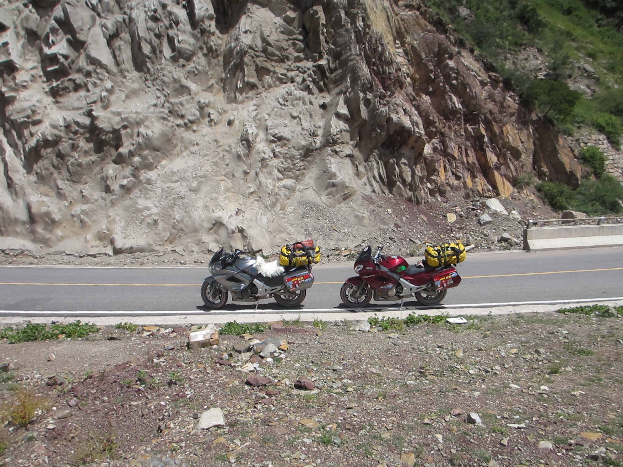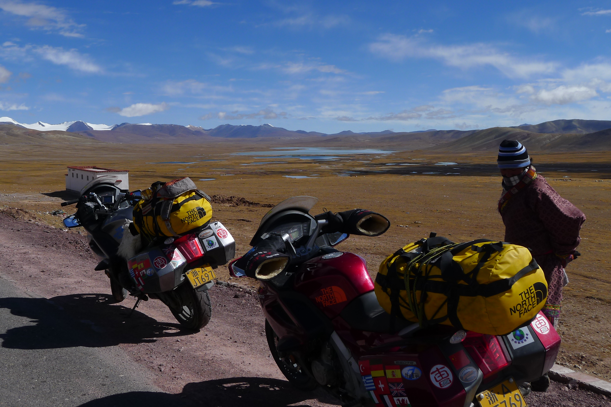 The tank of Fanny’s bike sprung a leak because a rubber supporting mount was missing and after 6,000 kilometers “on road” and “off road” it vibrated a crack in the attachment. A bit dangerous, especially as self immolation is illegal in Tibet. Therefore we had to ride with no more than 30% of fuel in the tank at all times which meant siphoning fuel from my tank for several hundred kilometers until we got a new tank in Lhasa sent from Hangzhou. All part of the testing program, I guess.