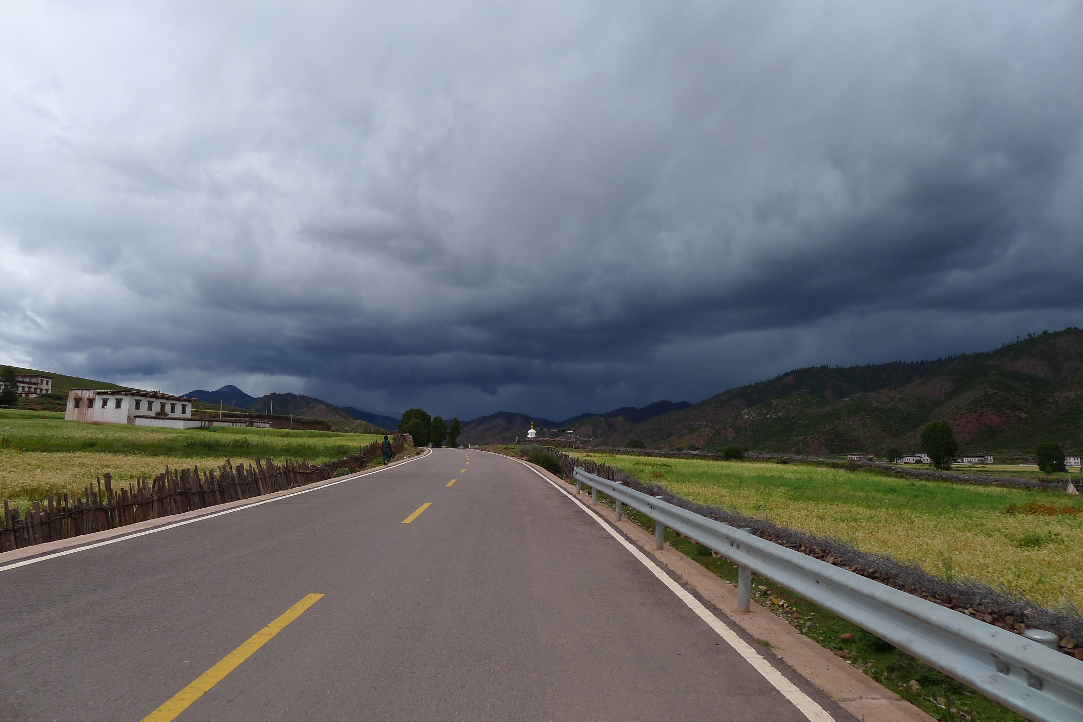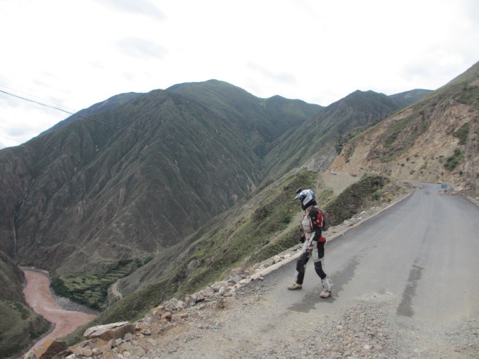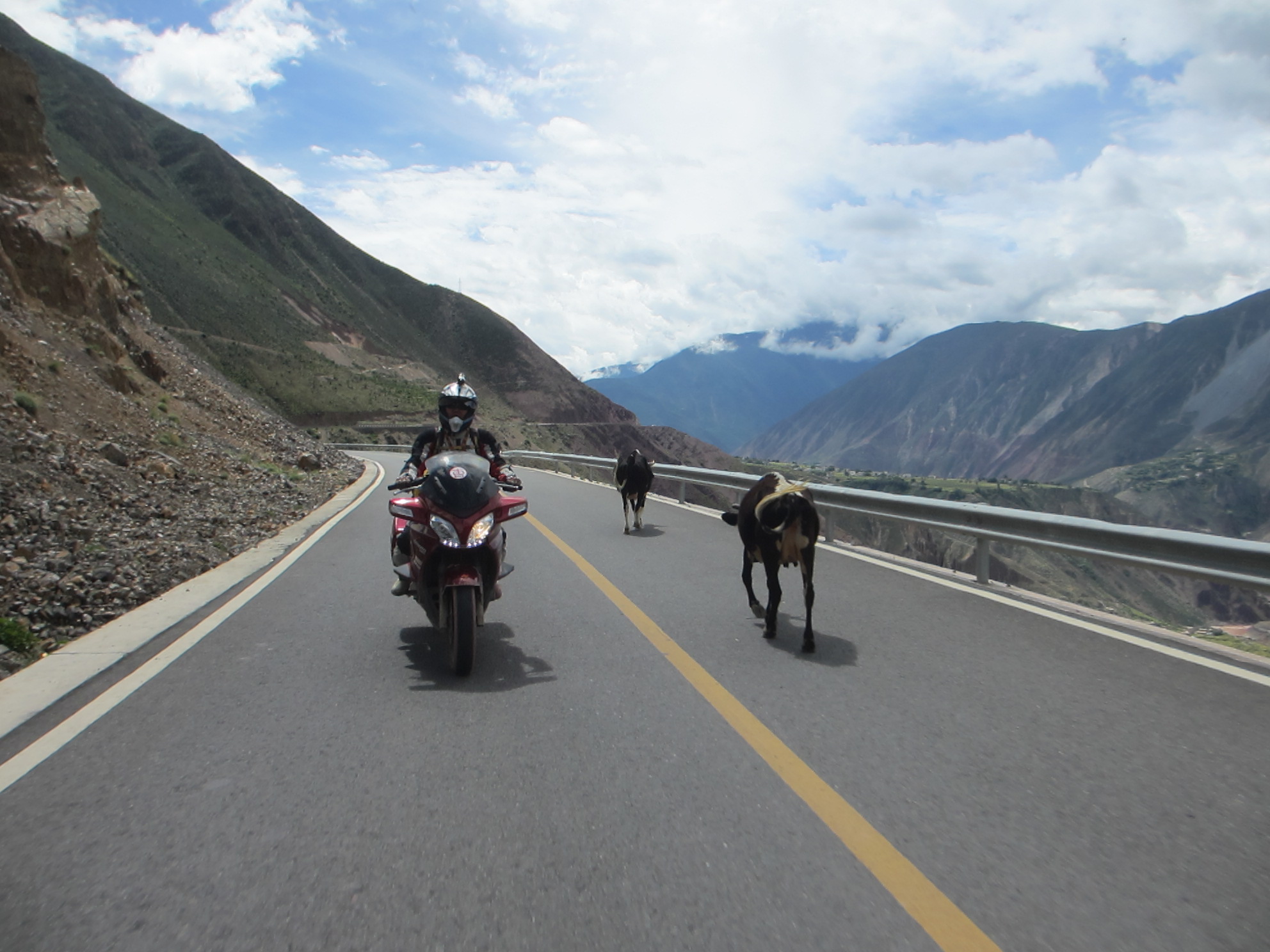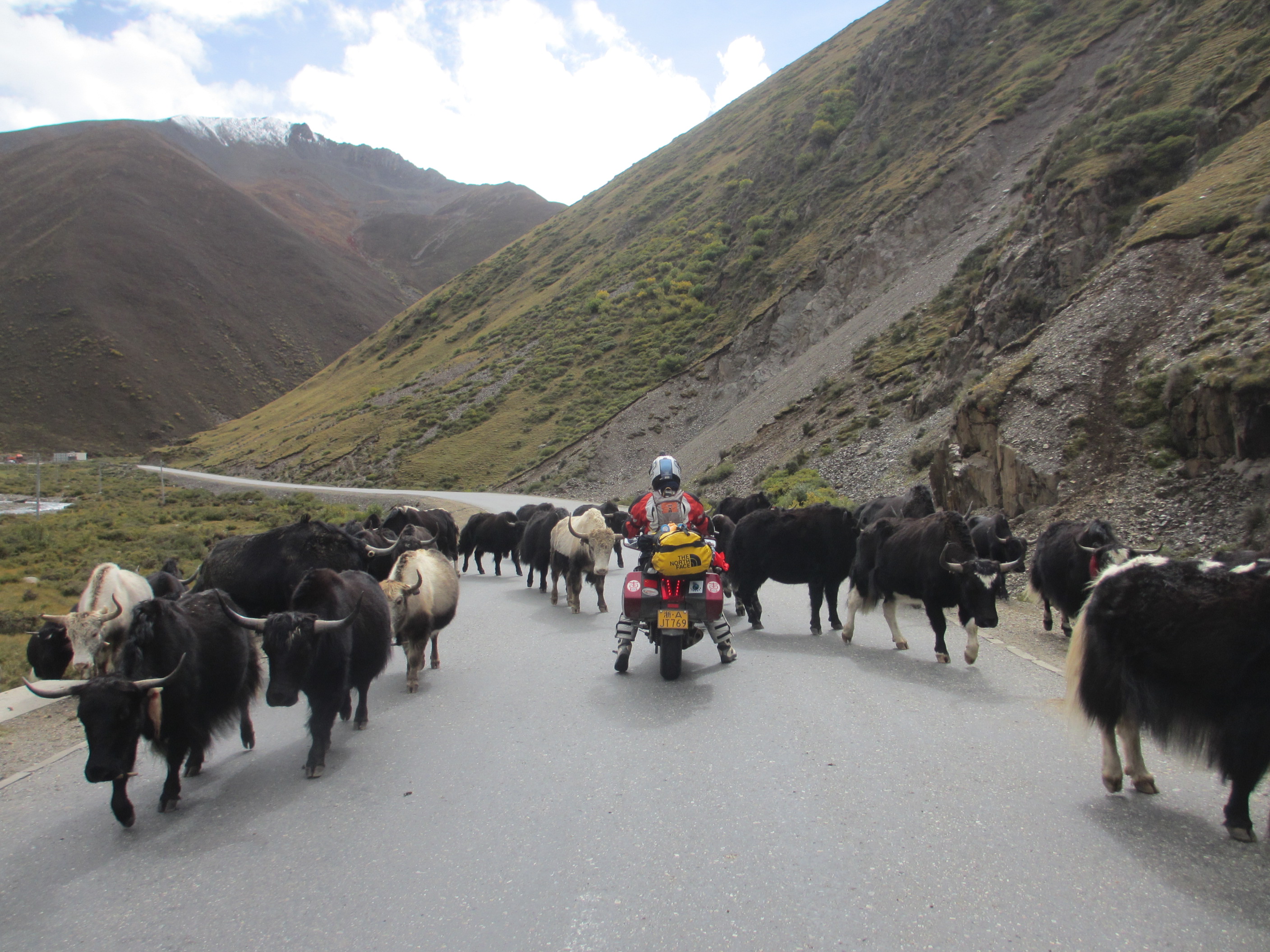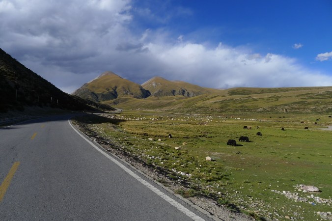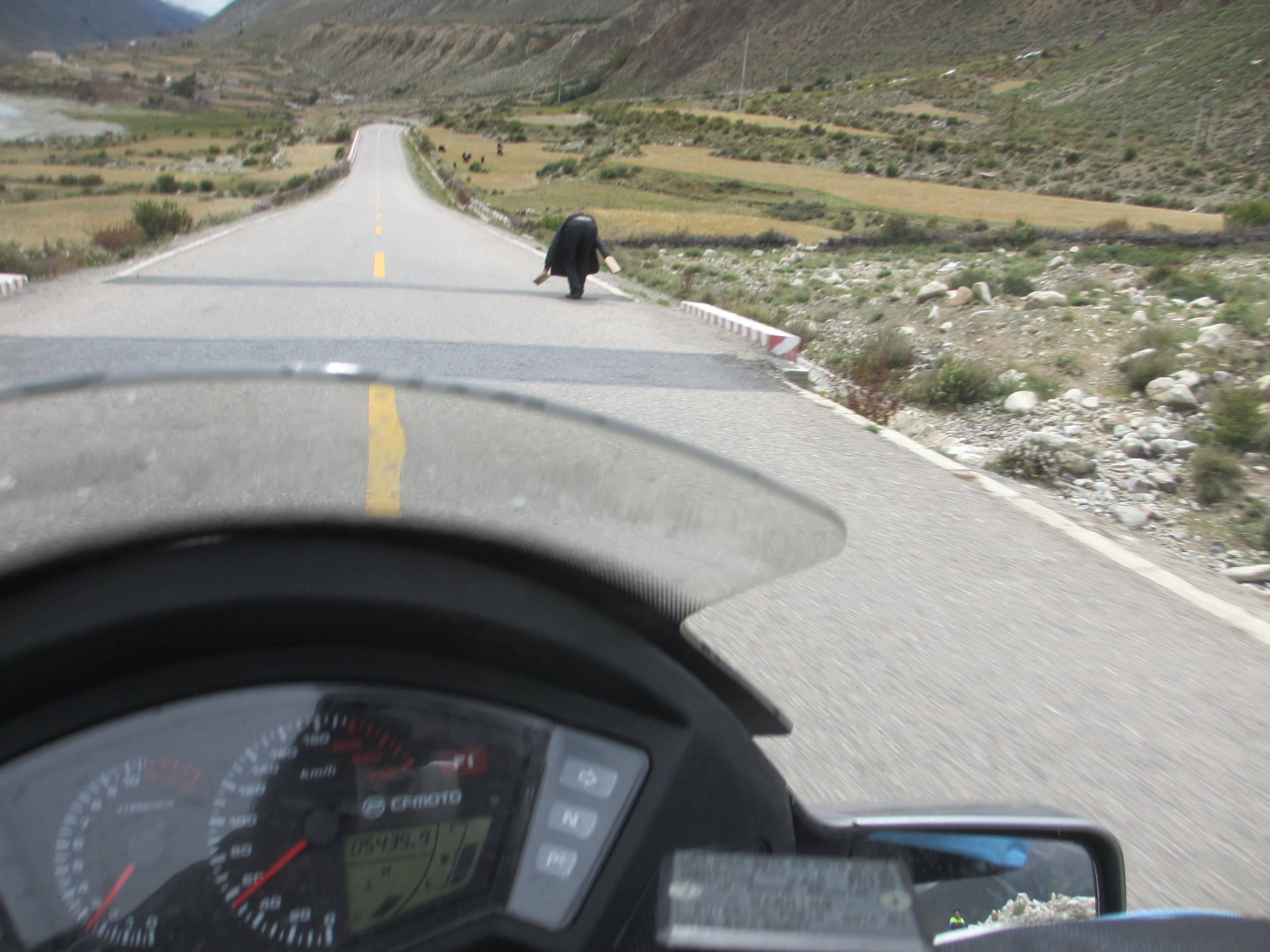 Riding along generally good tar roads, with occasional potholes, and stretches of gravel, mud or water flowing from streams across gullies. Biggest hazard is other drivers. This guy in front is on pilgrimage to Da Zhao Temple, Lhasa and every few steps lies prostrate towards direction of Lhasa. Some of these pilgrimages can take years and occasionally people die.