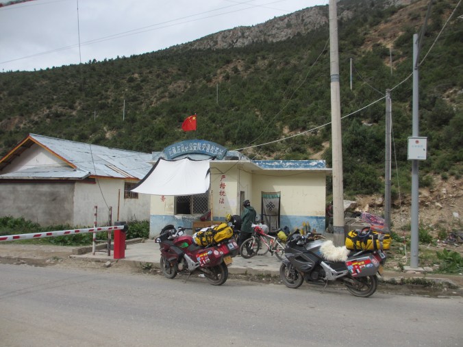 Entering town called 左贡。。。Tamade…. this time there were 特警, 警察, 军人 at the security post. Until this point we had ridden around them, under the barriers and confidently BS’d and smiled through the previous security check points. This time they were not impressed with my selection of Hong Kong discount cards and so we were detained. Two hours later after boring the pants off them they let us go… with a proviso that I shut up.