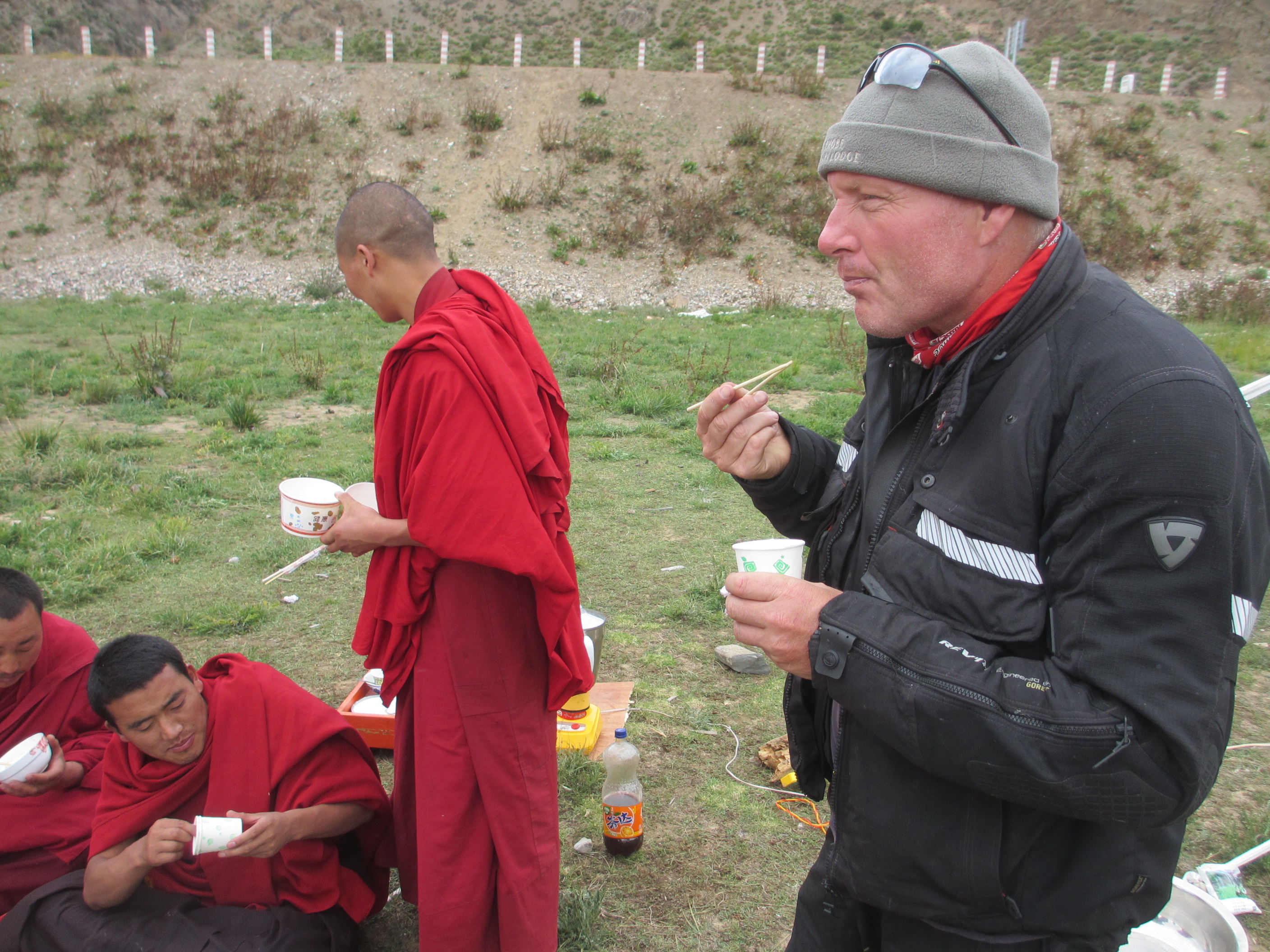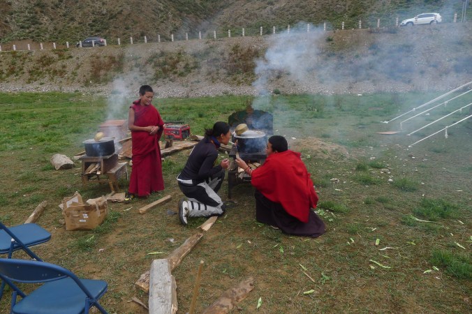 The next day we were invited to join the festivities. Unlike the monks I lived with in wu wei si in Dali, Yunnan, these Tibetan lamas are not vegetarian. They do eat meat and yaks meat, yaks butter, yaks fermented cheese, and yaks yogurt seemed to be staple foods, along with fresh vegetables from the local area. I am eating for the first time yaks yogurt and rice…. a sort of variation on the famous British rice pudding. The taste is somewhat challenging, as is eating it with chop sticks.