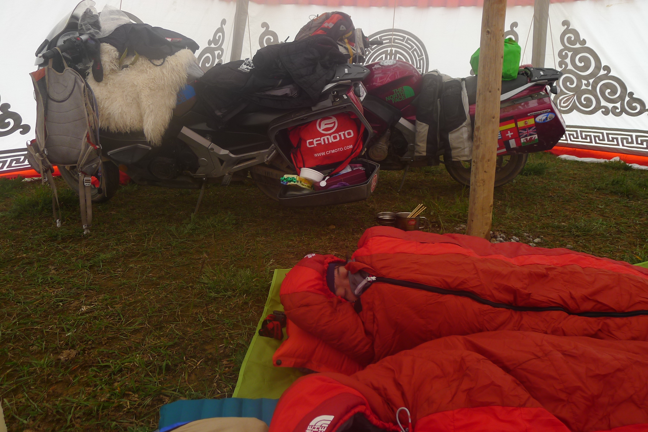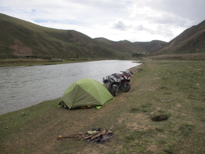 Fanny wrapped up in her North Face expedition sleeping bag together with our bikes inside Lamas’ tent. We were at 4,400 meters and it was bitterly cold during the night and I discovered that drinking beer at altitude gives you the mother of all headaches. Lesson learned, and clearly forgotten as later on in central Tibet at 4,900 meters we drank a bottle of champagne next to Sky Lake (Nam Tso) to celebrate. So!!!! Word to the wise… don’t drink alcohol at altitude. In fact, just drink the local tea. The salty sweet earthy tasting yaks milk brew found everywhere does help with altitude sickness, as did the Chinese medicine we were taking.