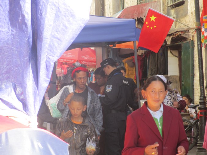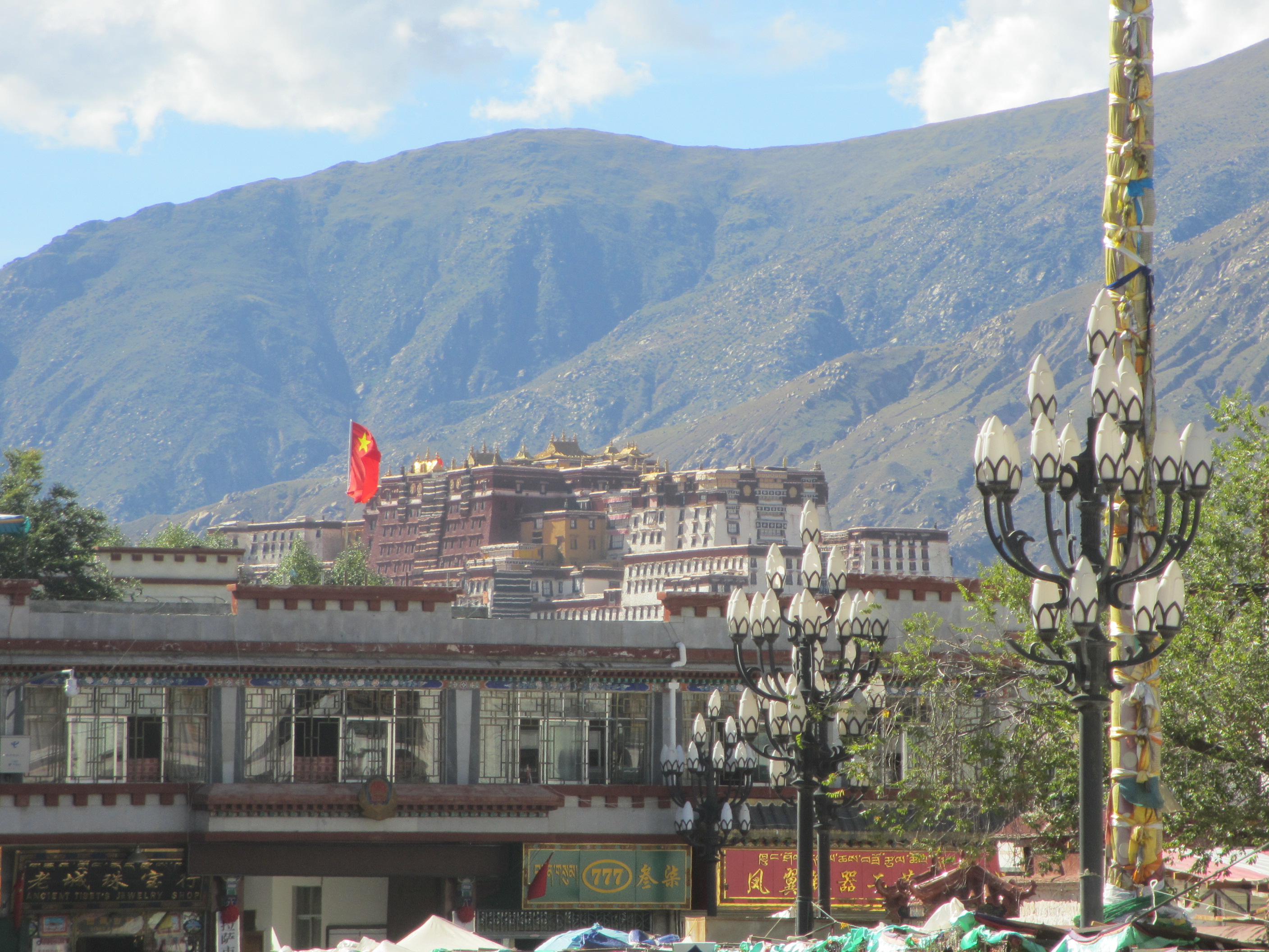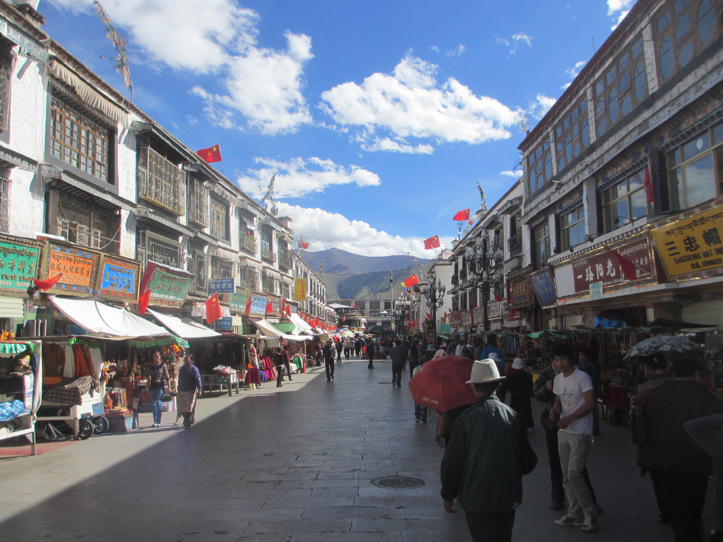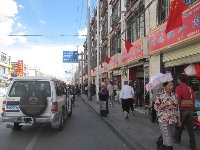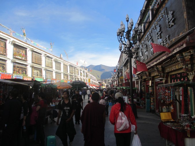 Tibetan streets, Chinese flags and skyline dominated by the beautiful mountains that surround Lhasa.