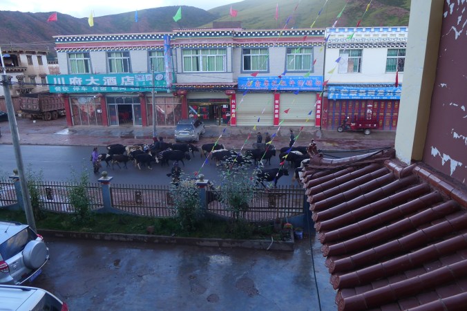 Gazing out of our hotel room at yaks wandering through the town center. As we got deeper into Tibet Fanny became more anxious that I should conceal myself. I was the only foreigner in this town, and indeed only saw other foreigners when we got to the capital, Lhasa. Even then they were in a tour group and being herded about under strict supervision. Luckily most of the time I was in riding gear with a crash helmet and riding a Chinese registered motorcycle … with a Chinese woman.