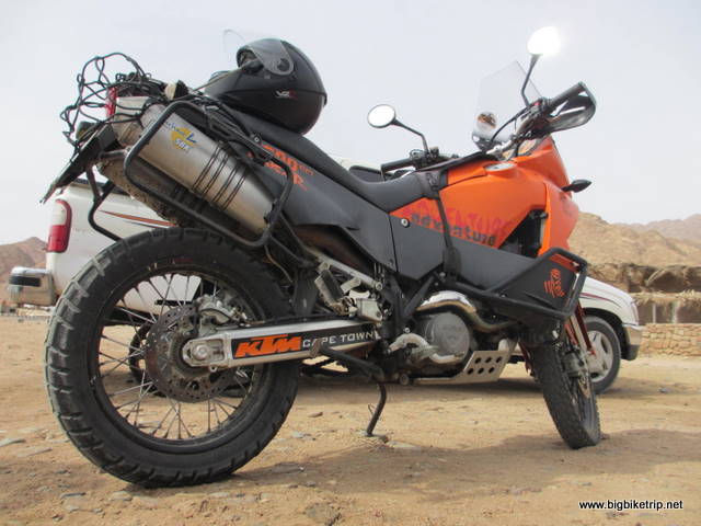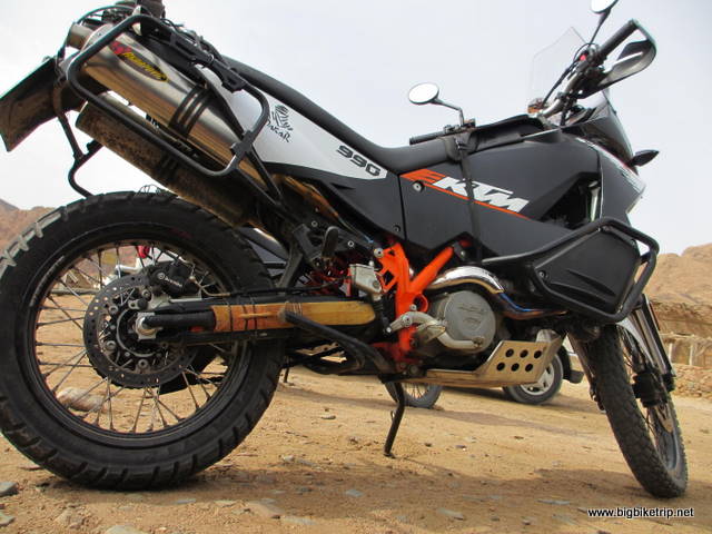 Later we were given “Camel Toes” by Adventure Parts which are a really good useful and attached to bottom of the side stand. The only time on the whole trip that my bike fell over was when I parked it on soft and sloping surfaces. I never had a moving fall on the whole expedition. Fanny on the other hand…??? She now has a gold medal in picking up her bike. Her KTM?  No problem apart from a few cosmetic scratches. KTM really are the bikes.
