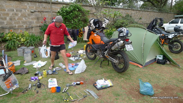 Kit audit in Nairobi…Searching Fanny’s panniers for contraband hair conditioner.
