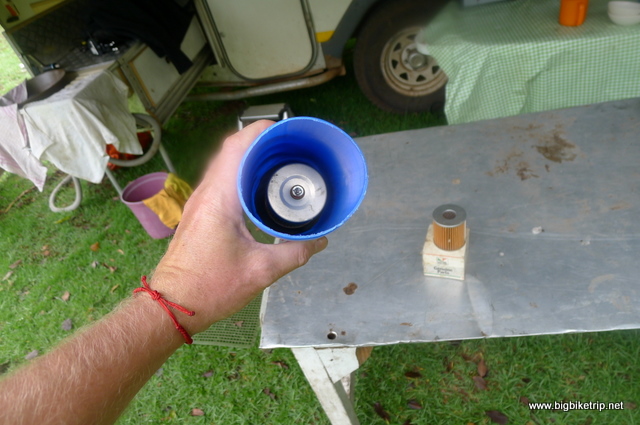 – more spare fuel filters from a cheaper supplier.  The petrol filter kits supplied by KTM Cape Town and Nairobi were ridiculously expensive for what they are and a search of internet can locate some sets for considerably less money. I didn’t think they were so important, I was wrong.  They will get dirty and a dirty fuel filter will starve the engine of fuel or seep impurities into the EFi which is a bad thing and the common cause of most motorcycle problems in Africa. We got around this problem by making a very good filter (The Steve Thomas .. see above) and filtering all the fuel before it went into the tank. Better safe than sorry .. as the adage goes.